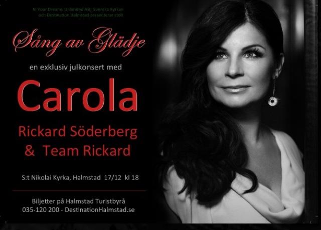 Tisdagen 17 dec bjuds det till julkonsert med Carola, Rickard Söderberg och Team Rickard i S:t Nikolai i Halmstad! När biljetterna till första konserten kl 18 släpptes tog de slut på ca 25 minuter och kön utanför Turistbyrån tycktes inte ha någon ände! Andra konserten kl 21 sålde även den slut på nästan ingen tid alls. Känns helt otroligt!